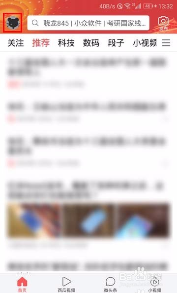 打開今日頭條的主界面后,點擊左上角的個人頭像,如下圖所示: