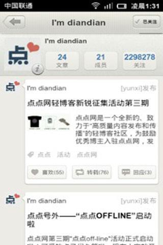 點點網(wǎng)手機客戶端,實現(xiàn)了閱讀、發(fā)布、評論、轉載、關注等主要功能,讓你隨時隨地發(fā)現(xiàn)興趣,展現(xiàn)自我。