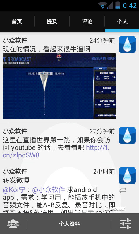 四次元微博客戶端是一款個(gè)人開發(fā)的新浪微博客戶端,實(shí)質(zhì)是個(gè)測試項(xiàng)目,用來構(gòu)思我所認(rèn)為的一個(gè) Android 微博客戶端應(yīng)該有的樣子,整體風(fēng)格是 Android Holo。【新浪微博軟件功能】
