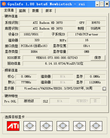 GPUinfo是國內(nèi)比較牛的顯卡識別軟件,是gpu-z等多不能比的,可以顯示硬件信息、BIOS版本、驅(qū)動信息、顯存類型、頻率信息等,并且還能通過更為底層的信息來識別NVIDIA 的顯卡,讓那些通過刷BIOS的假N卡無所遁形。