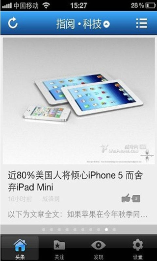 科技無處不在,科技資訊紛繁復雜,關(guān)注屬于我的科技資訊。指閱科技,你永遠不變的選擇。指閱 ? 科技是一款整合互聯(lián)網(wǎng)科技資訊,可個性化訂閱的應用軟件!是最專業(yè)的手機微媒體!指閱?科技將內(nèi)容劃分成移動互聯(lián)、社交網(wǎng)絡、Android、電子商務等十多個分類,有上千個主題,上萬個資訊網(wǎng)站來源!用戶可以完全根據(jù)喜好,按分類、按主題、按網(wǎng)站訂閱,瀏覽自己想看的文章,不想看的通通拋在腦后!頂尖的信息分類技術(shù),龐大的互聯(lián)網(wǎng)信息源,可自主訂閱的操作體驗,只需滑動手指,萬象資訊,一覽無遺!