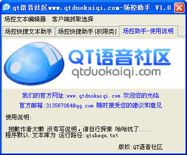 QT語音場控助手 1.2 綠色免費版 QT語音場控助手是一款QT語音輔助工具,集合了各種QT語音便捷功能,輕松當場控,告別復(fù)制,粘貼的苦逼時代,該工具是您玩轉(zhuǎn)QT語音的必備工具。