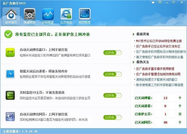 反廣告助手是一款針對(duì)廣告騷擾的永久免費(fèi)軟件,它能夠自定義添加規(guī)則關(guān)閉自己想關(guān)閉的彈窗、彈網(wǎng)頁(yè)、后臺(tái)進(jìn)程,還能鎖定IE主頁(yè)防止惡意篡改。而且它占用系統(tǒng)內(nèi)存小,運(yùn)行后對(duì)日常使用毫無(wú)影響,適合最小化隱藏到系統(tǒng)托盤(pán)長(zhǎng)期開(kāi)著,實(shí)在是居家上網(wǎng)必備好工具!