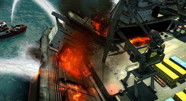 滅火四個(gè)船只建議安排如下。一輛專(zhuān)門(mén)負(fù)責(zé)給左邊的巨船降溫,其余三個(gè)集中力量由上至下?lián)錅绱w的火焰讓其僅僅在船頭區(qū)域燃燒(這么做的目的是避免其火焰擴(kuò)散到中間的裝貨區(qū)),然后你就可以輕松的慢慢把海港南邊的孤立火區(qū)一點(diǎn)一點(diǎn)吃掉。南部的海港區(qū)域比較孤立,不會(huì)擴(kuò)散到其他的地方