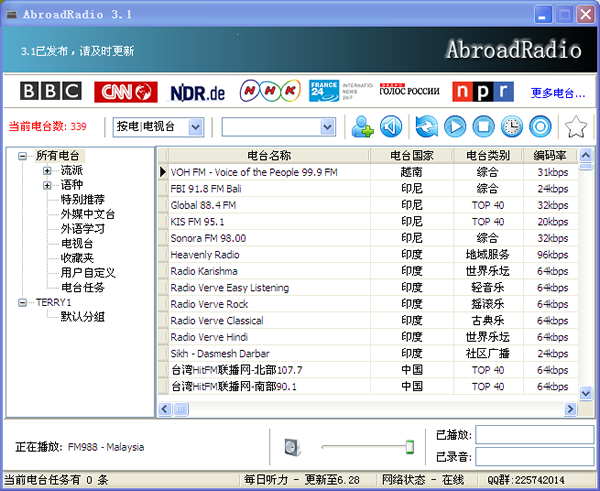 國外電臺(tái)AbroadRadio包括國內(nèi)外電臺(tái),含五大洲,四大洋,目前有近7800個(gè)電臺(tái),電臺(tái)分類也極細(xì),有搖滾樂,爵士樂,拉丁,舞曲,新聞,瑞格舞,熱帶雨林,宗教音樂,體育,佛教,喜劇等超過50種。另外還精選了世界上眾多的知名電臺(tái),包括有BBC,VOA,RAI,半島電視臺(tái),KBS,FOX,CNN,MBC,SKY,RAI,RFI等知名電臺(tái)。語言覆蓋了,中文,英語,日語,韓語,西班牙語,俄語,德語,意大利語等等。且據(jù)我親測,連通率都達(dá)到95%以上,更為關(guān)鍵的是,作者還為使用者提供了個(gè)性化的設(shè)置。即,你可以按照自己的想法和意愿讓作者對(duì)軟件進(jìn)定制,打造只屬于你的,獨(dú)一無二的軟件。