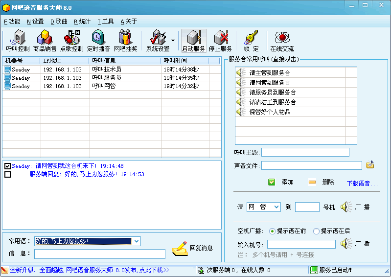 呼叫網(wǎng)管功能功能有呼叫網(wǎng)管,呼叫服務(wù)員,呼叫技術(shù)員,分別控制不同呼叫的時(shí)間間隔,有直接與主服務(wù)端文字對(duì)話(huà)功能,服務(wù)端亦有回復(fù)功能。
