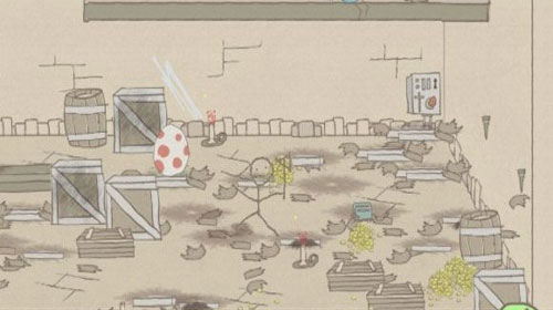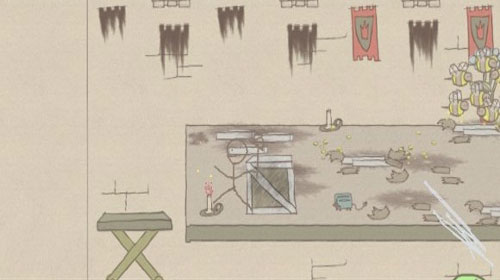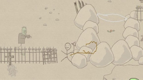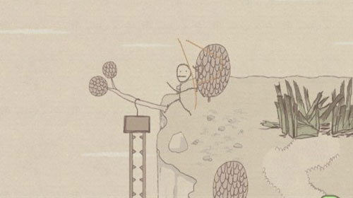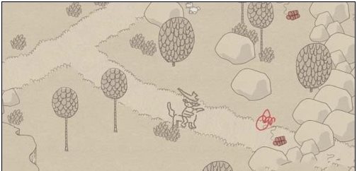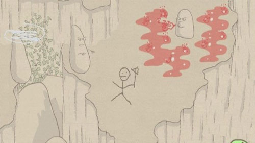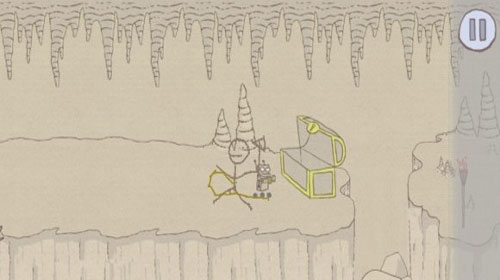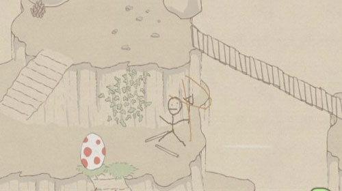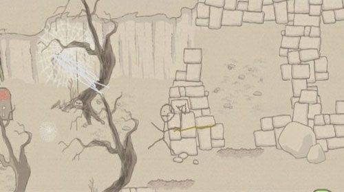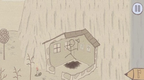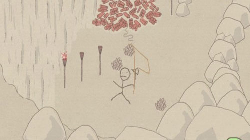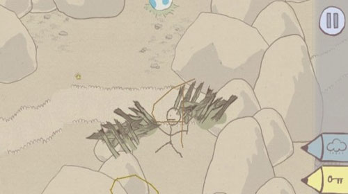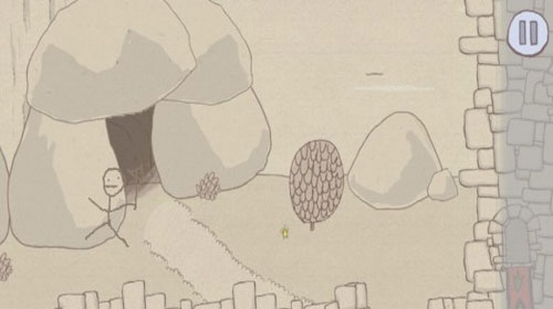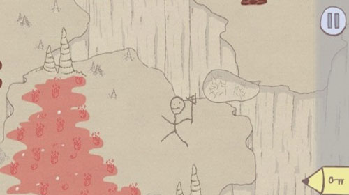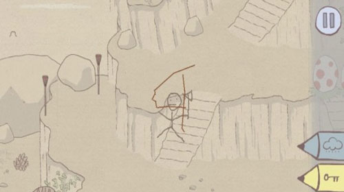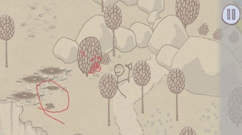 場景六,這關(guān)是相當(dāng)激情的一關(guān),我們學(xué)會了畫斧頭,可以用來砍樹,右邊是條死路,用火燒開上方的炸藥前進(jìn)。