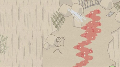 最后下山來到大炮處,畫一團(tuán)火點(diǎn)燃大炮的引信,讓大炮開兩炮,那邊的鐵門就被打開了,進(jìn)第一個(gè)鐵門就能過關(guān)。
