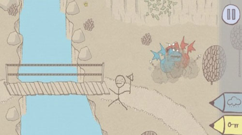 橋那邊是死路走不通,回頭發(fā)現(xiàn)懸崖邊上有幾根支撐的木頭,畫一把斧頭把木頭砍掉。橋塌了,可以從橋上過去了。