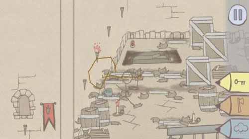 你被困住了,壞人在一旁嘰嘰喳喳說要奪走你的畫筆,在左邊的鐵箱子上方畫一朵烏云,將其劈開。