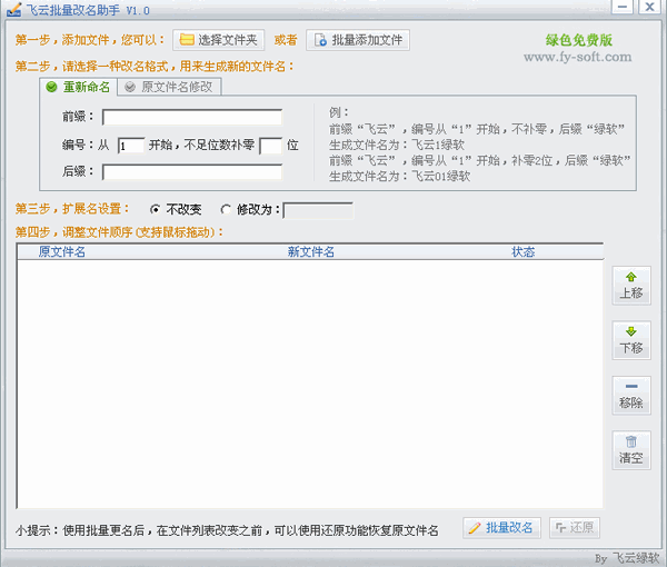 飛云批量改名助手 1.0 綠色版 飛云批量改名助手界面上有詳細(xì)的操作步驟說明,號(hào)稱最簡單易用的文件批量改名工具,即時(shí)您從未用過文件改名工具也能一看就懂。支持[批量重新命名]和[批量原文件名修改]兩種命名方式,支持原文件名恢復(fù),為用戶的意外操作增加一份安全保障。