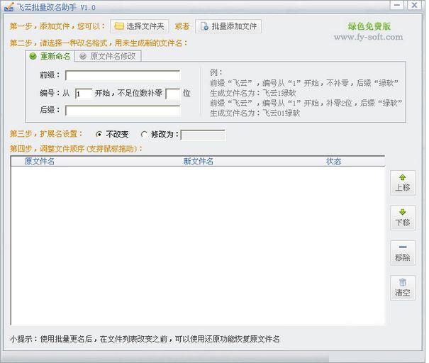 飛云批量改名助手是一款最簡單易用的文件批量改名工具。支持[批量重新命名]和[批量原文件名修改]兩種命名方式,支持原文件名恢復,為用戶的意外操作增加一份安全保障。