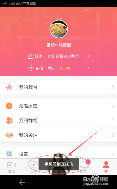 自動返回個人面板頁,底部提示“手機(jī)號綁定成功”