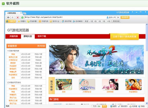 GT游戲?yàn)g覽器是一款專(zhuān)門(mén)針對(duì)網(wǎng)頁(yè)游戲玩家打造的專(zhuān)用瀏覽器。提供一鍵登錄,鼠標(biāo)錄制,自動(dòng)喊話(huà),游戲加速等網(wǎng)頁(yè)游戲?qū)俟δ?。并且提供《龍將》、《神曲》、《神仙道》等熱門(mén)游戲的每日最新開(kāi)服信息,讓你酣暢淋漓的享受網(wǎng)頁(yè)游戲的樂(lè)趣。