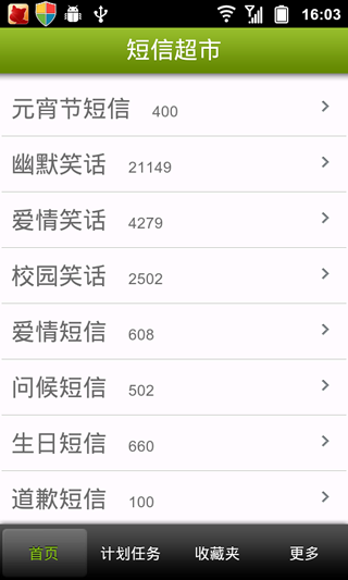 短信超市是一款免費(fèi)的短信輔助增強(qiáng)工具,系統(tǒng)擁有海量?jī)?yōu)質(zhì)節(jié)日短信,定時(shí)、群發(fā)、單發(fā),微博結(jié)合的發(fā)送方式,讓您發(fā)送短信不再那么麻煩,只要定好任務(wù),系統(tǒng)會(huì)自動(dòng)幫你做到全自動(dòng)化發(fā)送,單人定時(shí),多人定時(shí),統(tǒng)統(tǒng)可以,只要擁有了短信超市,讓您的生活一勞永逸,真正做到了簡(jiǎn)單,好用。讓您可以專心做其他更重要的事情,還可以發(fā)微博喲,新浪、人人、騰訊統(tǒng)統(tǒng)支持喲,趕快擁有吧,不要把包月短信留給運(yùn)營(yíng)商了,群發(fā)聯(lián)絡(luò)朋友吧,讓你的人氣迅速提升吧!美女帥哥需要你的關(guān)心喲!趕快行動(dòng)吧!【更新日志】