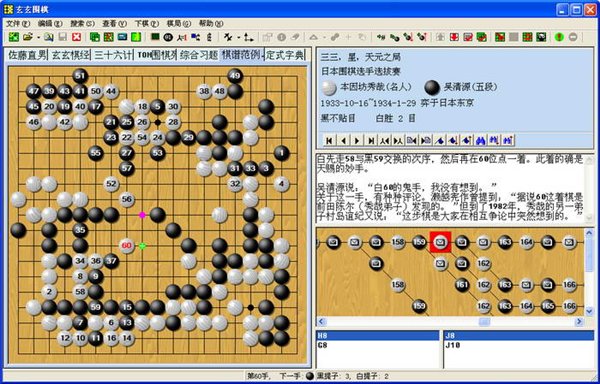 玄玄圍棋是一套多功能的圍棋軟件。它不僅是一套功能齊備的棋譜編輯與打譜軟件,還是一套專業(yè)的定式和死活題軟件,能編輯和制作死活題庫和定式庫。玄玄圍棋具有人工智能,能夠解死活題,在一定范圍棋力達到職業(yè)棋手的水平。玄玄圍棋還支持點對點的網(wǎng)絡(luò)對弈,以及以GNU-Go為引擎的電腦圍棋對弈。