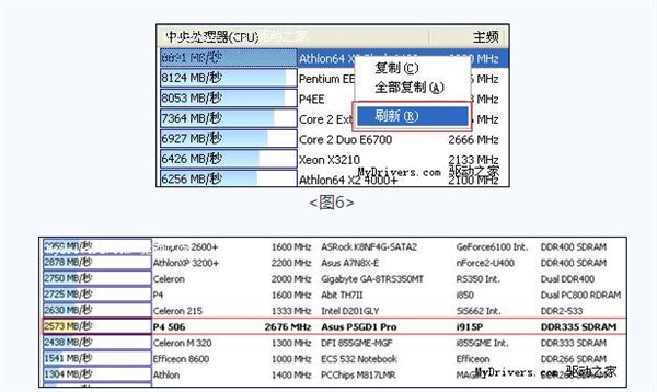 我舉例測試一下自己的內(nèi)存讀取性能,點擊“內(nèi)在讀取”,然后在右邊列表框里右擊-刷新,稍等即可查看自己的內(nèi)存讀取情況。你可以參考列表所給出的配置情況對比自己的內(nèi)存讀取速度排一個什么樣的位置。