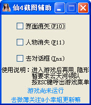 仙劍奇?zhèn)b傳4 截圖輔助工具功能簡(jiǎn)介:去邊框,去狀態(tài)欄,去對(duì)話框,人物隱形。還有隱形時(shí)怪物不追,而且可以百分百“偷襲成功”如果單純?nèi)?duì)話框用這個(gè)工具更好,