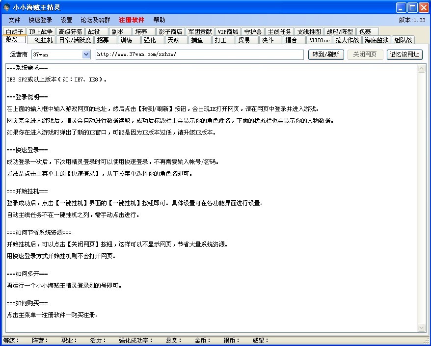 2.登錄說明,在上面的輸入框中輸入游戲網(wǎng)頁的地址,然后點(diǎn)擊【轉(zhuǎn)到/刷新】按鈕,會(huì)出現(xiàn)IE打開網(wǎng)頁,請(qǐng)?jiān)诰W(wǎng)頁中登錄并進(jìn)入游戲。網(wǎng)頁完全進(jìn)入游戲后,精靈會(huì)自動(dòng)進(jìn)行數(shù)據(jù)讀取,成功后標(biāo)題欄上會(huì)顯示你的角色姓名,下面的狀態(tài)欄也會(huì)顯示你的人物數(shù)據(jù)。如果你在進(jìn)入游戲時(shí)彈出了新的IE窗口,可能是因?yàn)镮E版本過低,請(qǐng)升級(jí)IE版本。