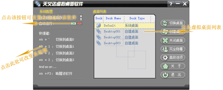 天艾達(dá)虛擬桌面軟件是一款非常優(yōu)秀的虛擬桌面軟件, 它易于使用并且功能非常強(qiáng)大, 如果您需要在Windows操作系統(tǒng)里同時(shí)創(chuàng)建多個(gè)桌面, 那么該軟件便是您的首選。 天艾達(dá)虛擬桌面軟件可以讓您在Windows操作系統(tǒng)里同時(shí)創(chuàng)建多個(gè)桌面, 這些桌面互不影響, 就像您同時(shí)擁有多臺(tái)電腦一樣, 您可以在一個(gè)桌面里玩游戲看電影, 在另一個(gè)桌面里做工作相關(guān)的事。 天艾達(dá)虛擬桌面軟件允許您為每一個(gè)桌面設(shè)置一個(gè)快捷鍵, 當(dāng)您按下該快捷鍵時(shí), 系統(tǒng)便會(huì)快速地從當(dāng)前桌面切換到該快捷鍵所對(duì)應(yīng)的那個(gè)桌面。