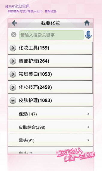 2.六大分類一應(yīng)俱全:化妝技巧、彩妝達(dá)人、發(fā)型設(shè)計、香氛世界、皮膚護(hù)理、化妝工具