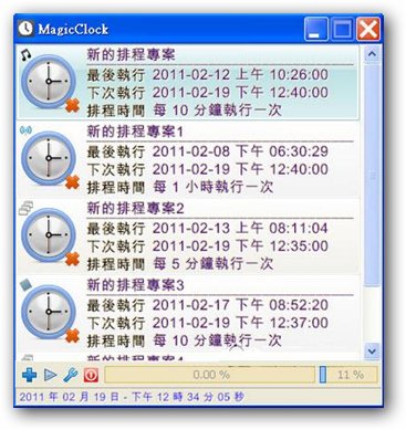 (MagicClock)是一套非常簡單的時間排程軟體,您可以指定每個時間執(zhí)行的動作,例入“執(zhí)行程式、播放音樂或電臺收聽...等等”,時間一到就會立即執(zhí)行,時間的設(shè)定可以從每幾分鐘執(zhí)行或者每天執(zhí)行都可自由設(shè)定,當(dāng)成早上起床的音樂鬧鐘再適合不過了,軟體完全免費,設(shè)定簡單方便,不失為一個好的定時工具程式。MagicClock 提供的相關(guān)功能