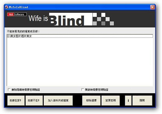 老婆看不到(WifeIsBlind),一款有趣而且功能不凡的文件隱藏工具,可以隱藏你的文件和文件夾目錄。