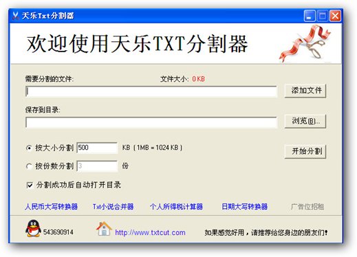 快速分割TXT類型文件,如記事本文件、TXT文本、TXT電子書等,可以按文件大小以及分割份數(shù)進(jìn)行分割。界面簡(jiǎn)潔,操作簡(jiǎn)單,尤其適用于小說愛好者。本軟件永久免費(fèi),無功能限制。