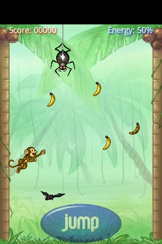 操作簡單上手!只要控制這只猴子在兩棵樹之間左右跳躍并遲到香蕉就可得分!不過要小心不要碰觸到畫面中間的那些蜘蛛、蝙蝠!游戲的時候只要按下屏幕下方的JUMP就可以讓這只猴子左右跳躍!