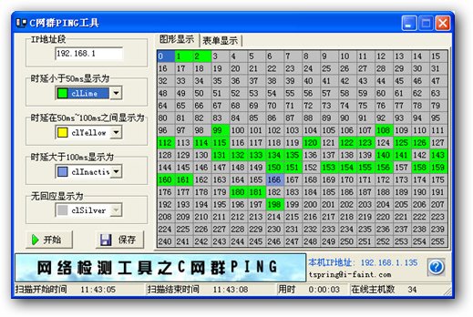 網(wǎng)絡(luò)檢測工具Cping 提供了對一個C類IP地址進(jìn)行ICMP測試的功能。通過255個線程進(jìn)行測試后,測試結(jié)果以四種色彩直觀的顯示出來,方便判斷。