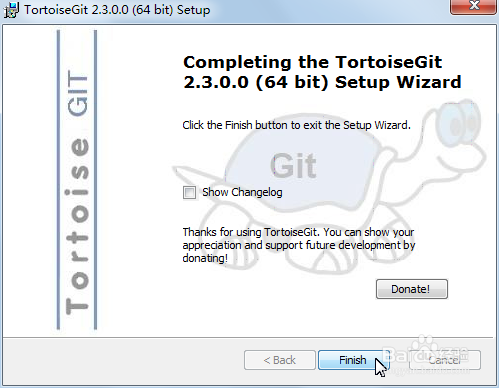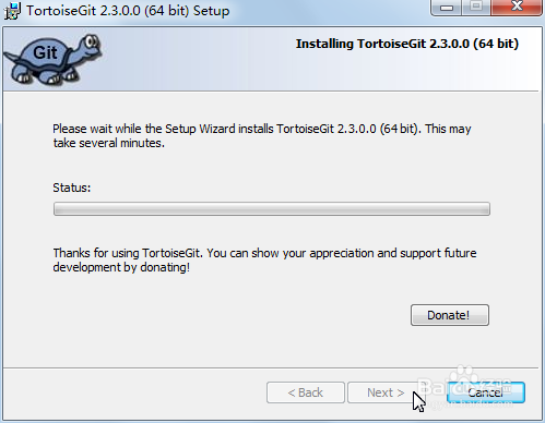 TortoiseGit安裝過程中,需要耐心等待一會(huì),如果愿意,你也可以“Donate!”為TortoiseGit捐款。