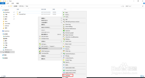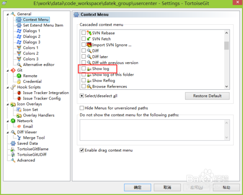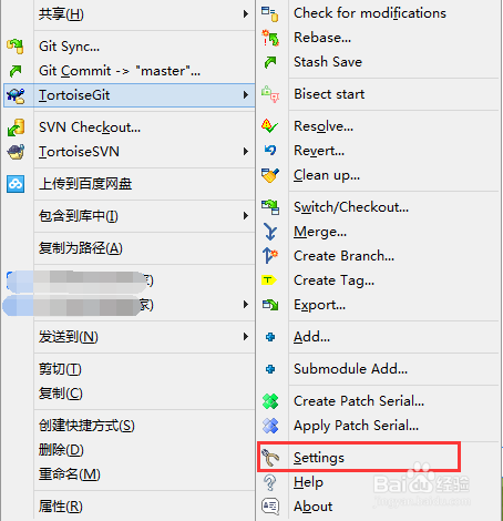 我們將Show log這個(gè)常用的查詢?nèi)罩镜牟藛螐亩?jí)添加到一級(jí),此處選擇TortoiseGit然后在二級(jí)菜單中選項(xiàng)“Settings”選項(xiàng)