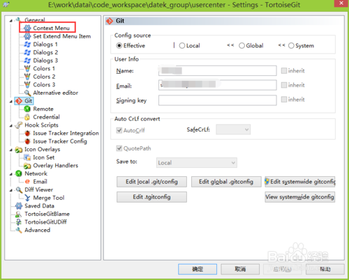 接下來我們配置一下Git的用戶和郵箱信息,右鍵【TortoiseGit】——【Settings】,在彈出的Settings窗體中選擇【Git】節(jié)點(diǎn),然后在User Info中可以設(shè)置Name和Email,點(diǎn)擊【應(yīng)用】即可。