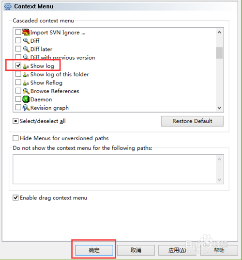 勾選上“Show log”查詢?nèi)罩镜墓δ懿藛?,然后點(diǎn)擊確定保存即可。這里可以同時(shí)添加多個(gè),或者把之前已經(jīng)勾選的去掉,則原來在一級(jí)右鍵菜單會(huì)移動(dòng)到二級(jí)菜單中了