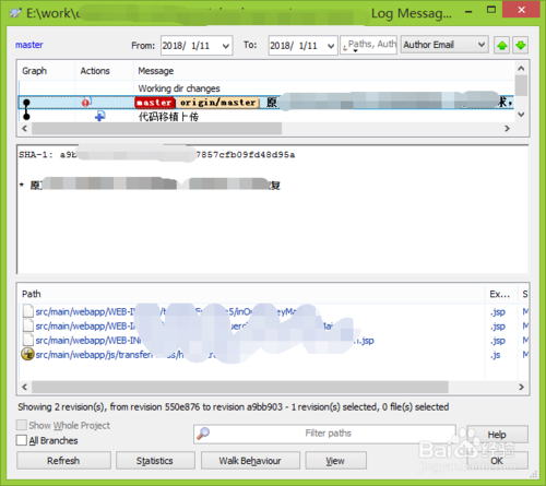 點(diǎn)擊查詢,則打開了Log Messge對(duì)話框,在這個(gè)頁面就是查詢?nèi)罩镜脑斍樾畔ⅲ罩拘畔⒗锇宋募峤蝗诵畔?,版本信息,詳?xì)的修改變動(dòng)的文件列表