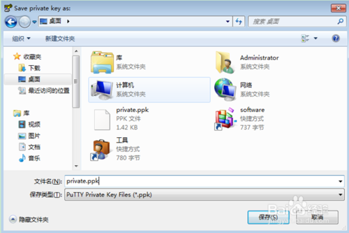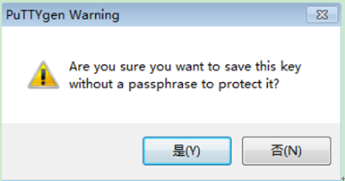 選擇Save private key,彈出如下對(duì)話框,選擇是,保存私鑰至private.ppk(考慮到信息安全及版本更新信息跟蹤需要,每個(gè)用戶自己妥善保存私鑰文件,不要隨意復(fù)制):