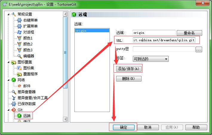 在彈出的【Settings】窗體中,選中【Git】——【Remote】節(jié)點(diǎn),在右側(cè)區(qū)域中,Remote中表示我們給可以給我們要推送代碼的遠(yuǎn)程倉庫起一個(gè)別名,在這里我們叫做origin;URL是我們GitHub倉庫的SSH地址;在【Putty Key】中我們選擇之前用TortoiseGit中的工具puttygen.exe生成的private key。設(shè)置完這些以后點(diǎn)擊【應(yīng)用】按鈕,然后點(diǎn)擊【確定】按鈕。