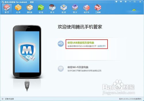 2、安裝完成后,打開”騰訊手機(jī)管家 for Android“程序,根據(jù)界面提示,用USB數(shù)據(jù)線將手機(jī)與電腦連接。