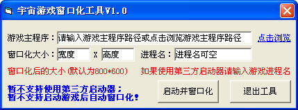 宇宙游戲窗口化工具使用D3D在指定游戲啟動前執(zhí)行窗口化,對游戲無影響、操作簡單,選擇游戲路徑即可啟動窗口化。支持大部分游戲。 宇宙游戲窗口化工具 v1.0更新: 程序加殼壓縮,減少誤報(bào)幾率。