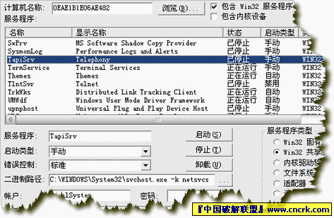 SrvAdmin 是一個(gè)高級(jí)的服務(wù)程序控制程序,完全可以用來替代 NT 服務(wù)程序和設(shè)備控制面板。它可以更改服務(wù)程序的配置(引導(dǎo)類型,錯(cuò)誤控制類型,文件路徑等),卸載服務(wù)程序和安裝新的服務(wù)程序。
