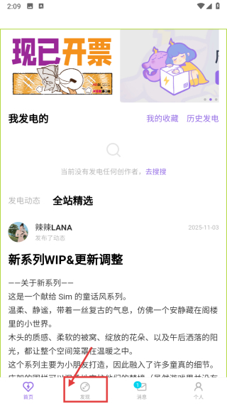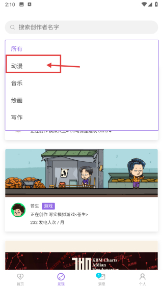 1. 點開創(chuàng)作類,點擊底部的發(fā)現(xiàn)選項,從而進入發(fā)現(xiàn)頁面。