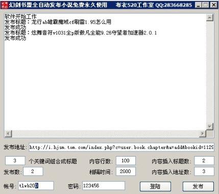 幻劍書(shū)盟全自動(dòng)發(fā)布小說(shuō) 1.0 免費(fèi)版 幻劍書(shū)盟全自動(dòng)發(fā)布小說(shuō)是一款免費(fèi)幻劍書(shū)盟小說(shuō)發(fā)布器,可以幫助用戶在幻劍書(shū)盟發(fā)布小說(shuō),隨機(jī)自定義關(guān)鍵詞生成標(biāo)題,隨機(jī)生成內(nèi)容,內(nèi)容隨機(jī)插入發(fā)布標(biāo)題,內(nèi)容隨機(jī)插入地址。