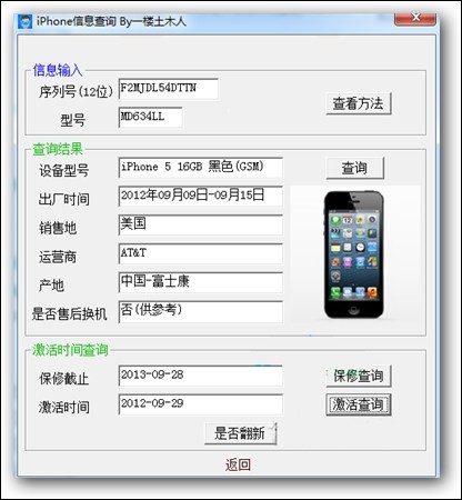 iPhone5,iPhone4S,iPhone4均可查詢,查詢結(jié)果比較詳細(xì)。iPhone 3GS,iPhone3G, iPhone(2G)查詢結(jié)果簡略,相信也沒什么人查了 iPhone4S、iPhone4帶官翻機(jī)識別功能,即售后換機(jī)/置換機(jī)。