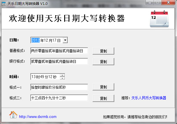 天樂(lè)日期大寫(xiě)轉(zhuǎn)換器,不需要注冊(cè)使用,永久免費(fèi),界面簡(jiǎn)單操作方便,歡迎大家下載使用。