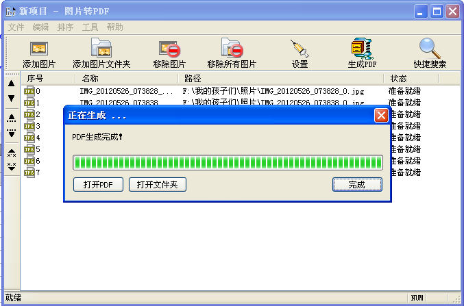 3.先檢查一下圖片文件的順序是否正確,然后點(diǎn)擊生成PDF按鈕生成PDF文件, 這一步你要選擇保存PDF文件的位置。