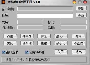 番茄窗口管理工具 V1.0 免費版 番茄窗口管理工具,用這個工具可以看出一個程序是用什么語言編寫的,用這個工具查看程序的窗口或控件,如果窗口或控件的類名均以t開頭,那有非常大的幾率表明該軟件就是用delphi或者c++ builder開發(fā)的,同時根據(jù)工具獲得的控件類名,你還可以知道該軟件使用了什么第三方組件。另外,工具還集成了按鈕可用或禁用功能,可以使被禁用的按鈕或控件變?yōu)榭捎谩?BR>