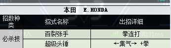 作為相撲選手本,一直收到玩家們的喜愛,當(dāng)年我不會出招的時候就一直使用這個人物,然后狂按鍵;詳情參考下圖
