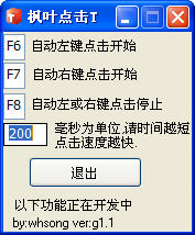 楓葉鼠標(biāo)點(diǎn)擊器支持:鼠標(biāo)左鍵與右鍵自動點(diǎn)擊,并支持熱鍵f6,按下左鍵自動點(diǎn)擊;如要自動鼠標(biāo)右鍵點(diǎn)擊,可按下f7;另定義f8為自動停止點(diǎn)鍵,還支持自定義選擇左右點(diǎn)擊速度調(diào)整!楓葉鼠標(biāo)點(diǎn)擊器體積小不用安裝的軟件,楓葉鼠標(biāo)點(diǎn)擊器解放你的雙手!