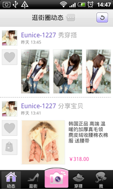 《逛街啦》是全球最大的中文女性社區(qū)愛物網(wǎng)旗下網(wǎng)站,是以發(fā)現(xiàn)•分享•交流概念為主的時尚逛街圈。逛街啦和每位愛漂亮的女孩一起,隨時隨地策劃自己的時尚風(fēng)格。在公車上,在地鐵里,窩在被窩里,你都可以逛街啦!