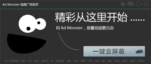 Ad Monster視頻廣告屏蔽助手是一款簡(jiǎn)單,直觀,功能強(qiáng)大的視頻廣告屏蔽助手,可以讓您觀看視頻更自由,本軟件支持屏蔽影趣視頻,優(yōu)酷,土豆,騰訊,愛(ài)奇藝,56,迅雷看看,搜狐,樂(lè)視,PPTV PPS 鳳凰,酷6,激動(dòng),新浪,6間房,CNTV M1905等18個(gè)主流視頻網(wǎng)站的視頻廣告